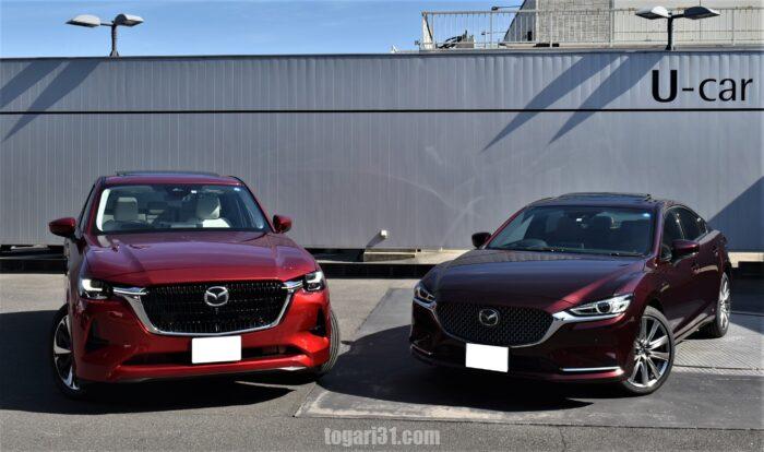 CX-60のラグジュアリーグレード”プレミアムモダン”とフラッグシップセダンのアーティザンレッド。